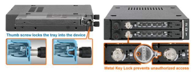 מגירה לשתי דיסקים קשיחים שליפה מהירה עם נעילה Icy Dock ToughArmor EX MB492SKL-B Industrial Rugged Full Metal 2 x 2.5'' SATA/SAS HDD & SSD Mobile Rack for External 3.5'' Drive Bay