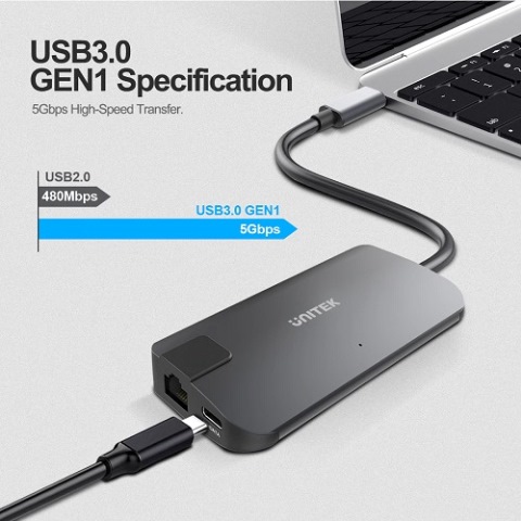 תחנת עגינה למחשב נייד משולב כרטיס מסך חיצוני ומתאם רשת יוניטק Unitek Y-DK09016 USB3.1 Type-C Multi-Port Hub with Power Delivery
