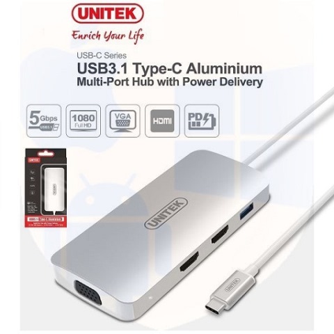 דגם מולטיפורט+טעינה Unitek Y-9116 USB3.1 Type-C Aluminium Multi-Port Hub with Power Delivery
