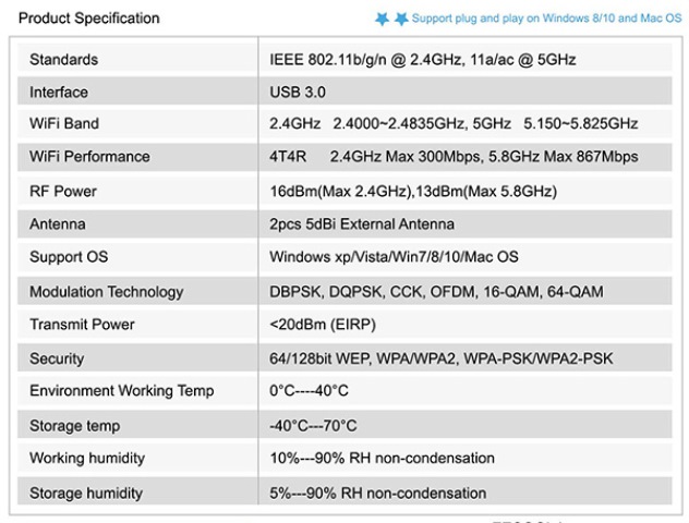 כרטיס רשת אלחוטי עומצמתי 2 אנטנות דואל בנד EZCool UWF-901 1200Mbps AC1200 Dual Band USB3.0 WIFI Dual Band 2.4 GHz, 5GHz Adapter Two 5dBi external antenna
