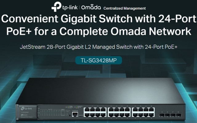 רכזת רשת מתג 28 ערוצים כולל מתח לכל ערוץ 10/100/1000 TP-Link TL-SG3428MP JetStream 28-Port Gigabit L2 Managed Switch with 24-Port PoE+