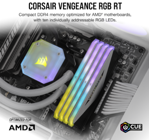 זיכרון CORSAIR VENGEANCE RGB RT DDR4 מחזק את האסתטיקה של המחשב האישי שלך תוך שהוא מספק ביצועים יוצאי דופן המותאמים למערכות AMD.