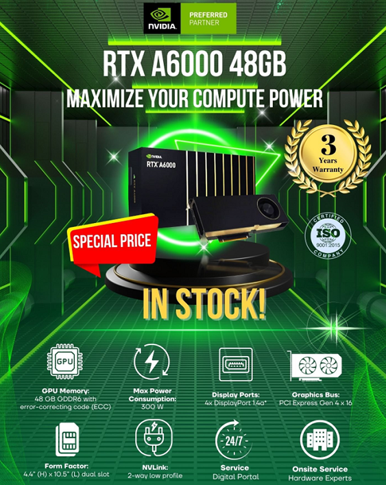 • קנה מידה של ביצועי יישומים אפילו יותר עם טכנולוגיית NVIDIA NVLink המאפשרת לך לשלב שני כרטיסי RTX A6000 כדי להכפיל את זיכרון ה-GPU והביצועים האפקטיביים במארז תחנת עבודה אחת ל-96 GB.