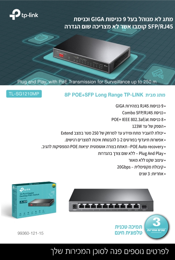 TP-Link TL-SG1210MP - הינו מתג לא מנוהל בעל 9 כניסות GIGA וכניסת SFP/RJ45 קומבו אשר לא מצריכה שום הגדרה.