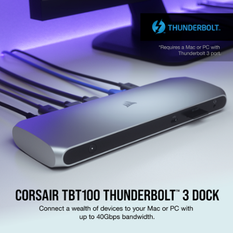 חבר שפע של מכשירים ל-Mac או PC שלך עם CORSAIR TBT100 Thunderbolt™ 3 Dock, המתגאה ברוחב פס של עד 40Gbps תוך טעינה יעילה של המחשב הנייד שלך עם טכנולוגיית טעינה חכמה.