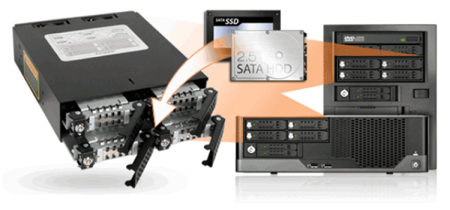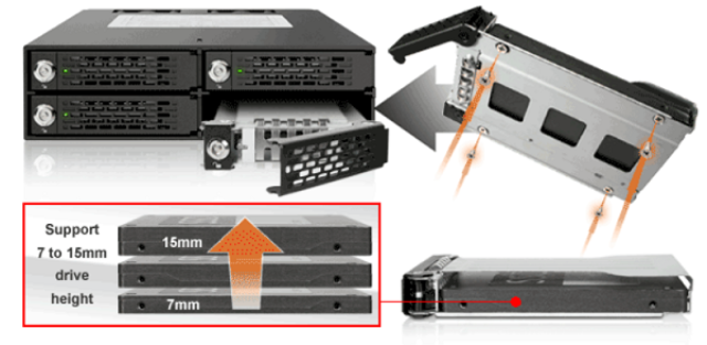 ה-ICY DOCK ToughArmor MB994SK-1B לוקח 4 x 2.5 אינץ' SAS/SATA HDD/SSD מגובה 5 מ"מ עד 15 מ"מ, ותומך בהחלפת כוננים מהירים וקלים.