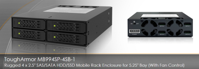 מגירה לארבעה דיסקים קשיחים שליפה מהירה מוקשח Icy Dock ToughArmor MB994SP-4SB-1 Rugged 4 x 2.5" SAS/SATA HDD/SSD Mobile Rack Enclosure for 5.25" Bay (With Fan Control)