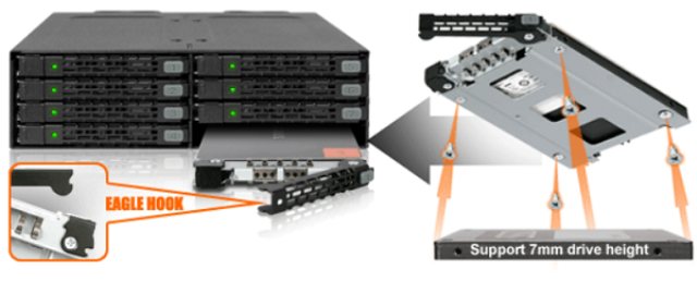 הוא מתהדר ביכולת לאחסן כונני SATA חסרי תקדים בגודל 8 x 2.5 אינץ' עם גובה של 5 מ"מ עד 7 מ"מ בתוך מפרץ חיצוני יחיד בגודל 5.25 אינץ', מה שהופך אותו לפתרון האולטימטיבי עבור יישומי אחסון צפופים.