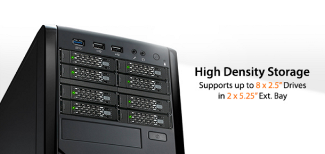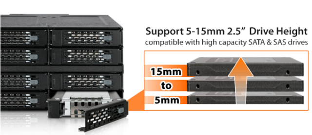 הכירו את ICY DOCK ToughArmor MB508SP-B כלוב כונן 2.5 אינץ' עם 8 מפרצים עבור כוננים קשיחים ו-SSD, המיועד לאחסון בצפיפות גבוהה של 8x 2.5 אינץ' SAS/SATA HDD/SSD מ-5-15 מ"מ בכונן אופטי 2x 5.25 אינץ' CD/DVD מפרצים, מה שהופך אותו לכלוב הכוננים הצפוף ביותר הזמין התומך בכוננים מלאים של 15 מ"מ.