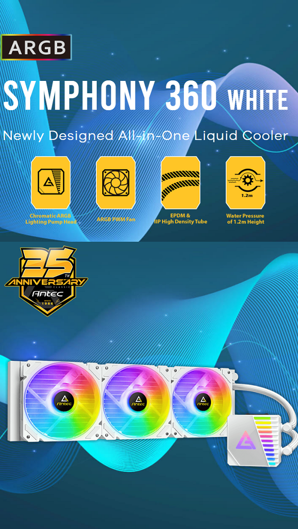 קירור נוזלי למעבד מחשב אנטק Antec SYMPHONY White 360 ARGB 115X/1200/1366/2066/2011/1700 All-in-one Liquid Cooler ARGB Fans 0-761345-74042-5