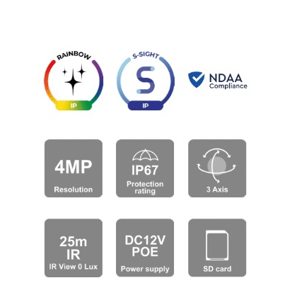 מאפיינים DV-340SRN-28 • 1/3" CMOS (16:9) • Resolution: 2560x1440 25/30FPS (4MP) • Lens: 2.8mm (99°) • 24/7 Full-Color Day Mode • IR Range: 25m (2 High-Power White LED) • H.265 / H.264 / H.265+ / H.264+ / MJPEG (Substream only) • General Analytics: Camera Tampering • Standard Analytics: Line Crossing, Sterile Area • True WDR (120dB), BLC, HLC, ROI Support • PoE • SD Card Support (Up to 256GB) • Built-in Microphone + Audio Input • ONVIF • IP67 • Weight: ~450g • Power: DC12V/~460mA / PoE/~5.5W