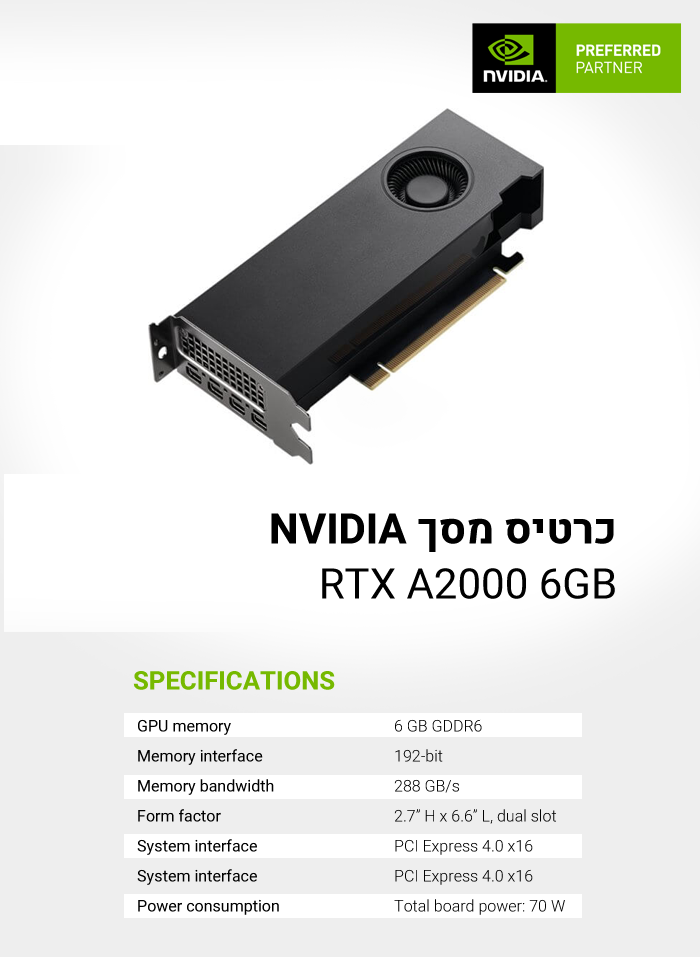 כרטיס מסך מקצועי לגרפיקה ועריכה תמיכה ב-4 צגים PNY NVIDIA Quadro Ampere RTX A2000 VCNRTXA2000-SB 6GB GDDR6 192BIT mDPx4