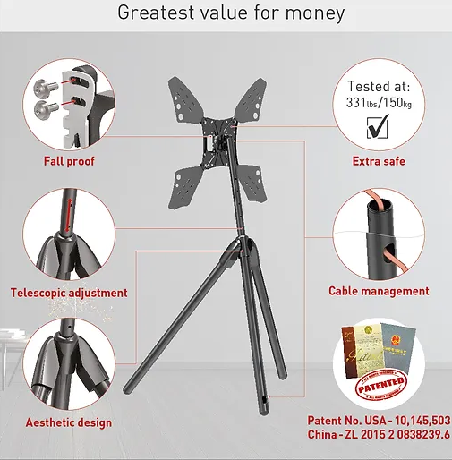 חצובה רצפתית אלגנטית לטלוויזיה עם אפשרות הטייה וכוונון גובה.