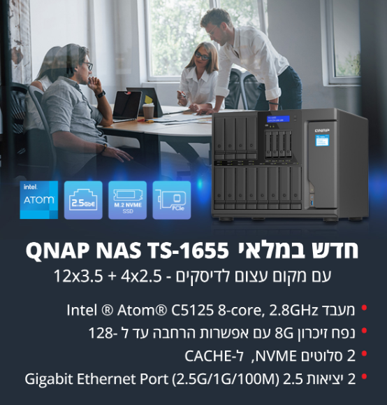 !!! שרת NAS ל 12 כוננים 3.5 ,4 כוננים 2.5 ו2 לNVME קיונאפ QNAP TS-1655-8G Intel Atom C5125 2.80GHZ Dual Core 8GB RAM Powerful 2.5GbE hybrid storage solution