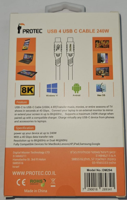 כבל טאנדרבולט 4 העברת נתונים וטעינה מהירה לסמארטפון ומחשב נייד מטר וחצי עד 240W מקצועי פרוטק Protec DM294 USB-4.0 IF USB-C TypeC CABLE 240Watt 40GB 8K 60Hz 1.5Meter