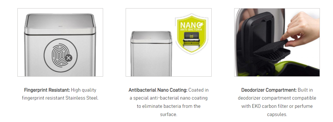 ציפוי ננו אנטיבקטריאלי מיוחד הוחל גם כדי לסייע בשמירה על חיידקים. יש גם את היתרון הנוסף של אטם סיליקון ללכידת ריחות בפנים ותא מובנה לניקוי ריח שיעזור לשמור על ריח רענן של הפח שלך.