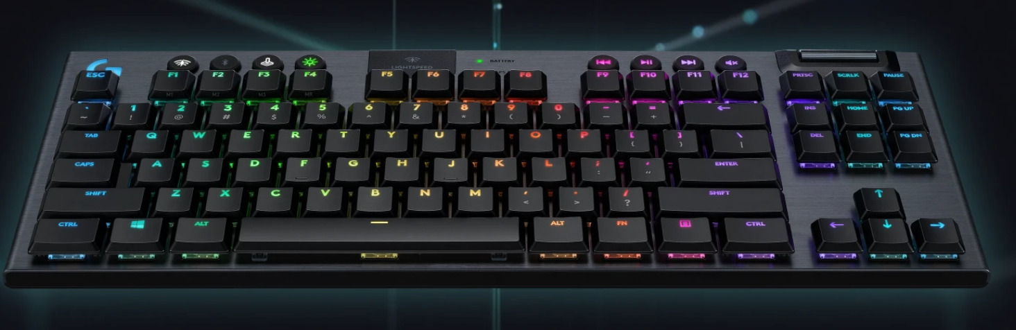 G915 TKL כולל LIGHTSPEED אלחוטי ברמה מקצועית, LIGHTSYNC RGB מתקדם ומתגים מכאניים בעלי ביצועים גבוהים בפרופיל נמוך.