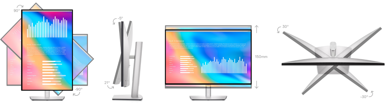 חווה נוחות שנעשתה עבורך על ידי הטיה, סיבוב, סיבוב והתאמת גובה הצג שלך (מקסימום 150 מ"מ).
