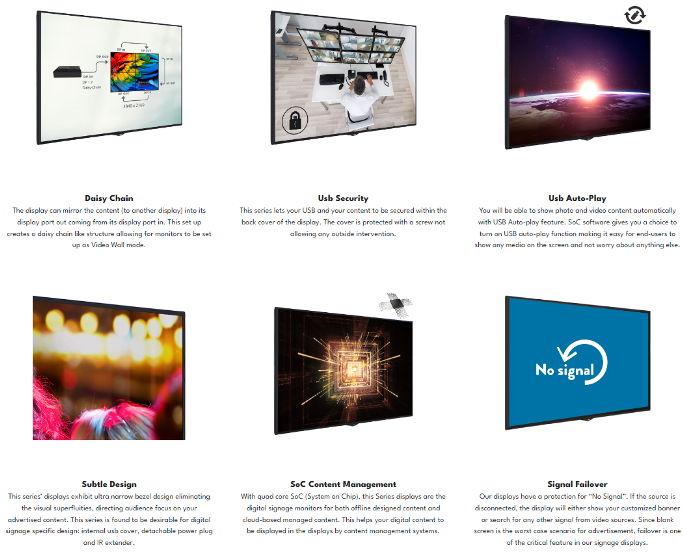עם ארבע ליבות SoC (System on Chip), צגי סדרה זו הם צגי השילוט הדיגיטלי הן עבור תוכן מעוצב במצב לא מקוון והן עבור תוכן מנוהל מבוסס ענן. זה עוזר לתוכן הדיגיטלי שלך להיות מוצג בתצוגות על ידי מערכות ניהול תוכן.