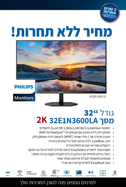 מסך מחשב דק רחב מקצועי כולל רמקולים מובנים Philips 32E1N3600LA 32 Inch W-LED VA 2560x1440 QUAD HD 2K 4ms 75Hz Flicker-free LowBlue DisplayPort 1.2+ HDMI USB Type-C