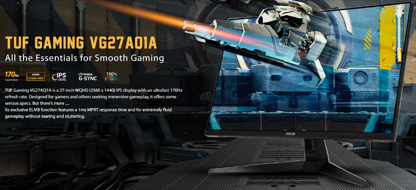 מסך מחשב לגיימרים 27 אינץ' עם רמקולים מובנים אסוס Asus VG27AQ1A TUF Gaming 27 Inch 2K 2560x1440 WQHD 170Hz IPS 1ms HDMI DP Speaker G-Sync
