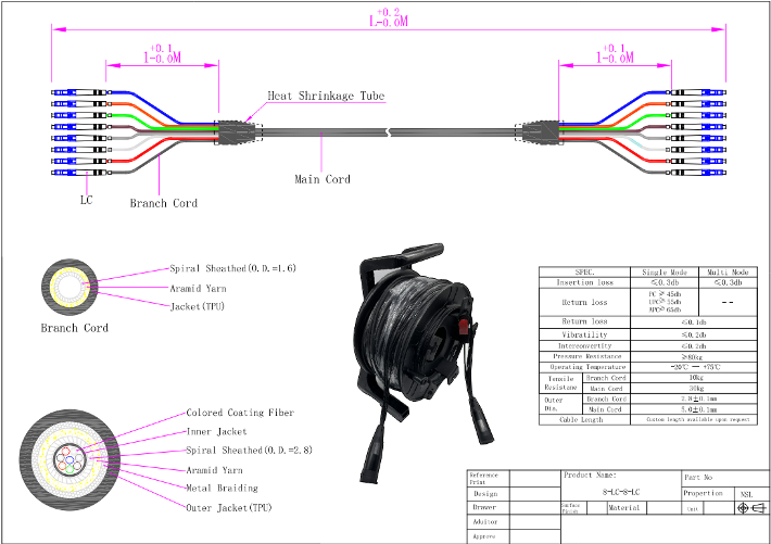 כבל אופטי טקטי על גלגלת עם 8 סיבים MM OM3 מחברי LC באורך 300 מטר TopX DRM0108-300