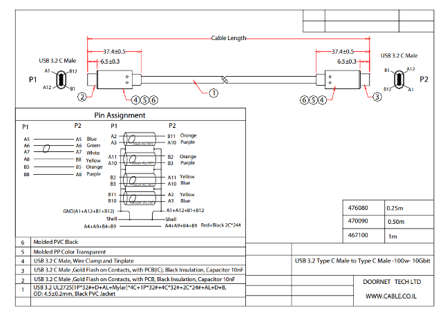 תיאור כבל USB 3.2 Type-C זכר-זכר 10G הספק 100W אורך 1 מטר