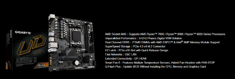 לוח-אם למעבד איי.אמ.די רייזן AM5 גיגהבייט Gigabyte A620M H 1.2 DDR5 PS/2 HDMI DP 1GbE