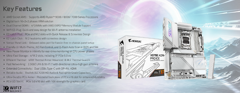 לוח-אם צבע לבן למעבד איי.אמ.די רייזן AM5 לגיימרים ג'יגהבייט Gigabyte X870E AORUS Pro ICE ATX DDR5 WiFi 7 Bluetooth 5.3 2x NVME Gen5 2x USB-C Support DP 2.5GbE