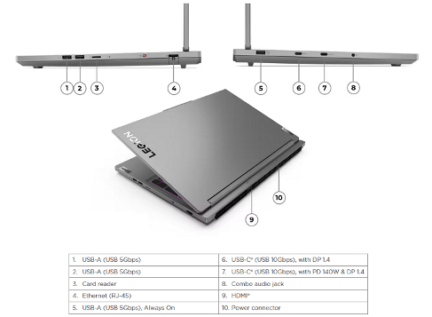 חיבורים: 3xUSB 3.2 Gen 1(One Always On), 2xUSB-C 3.2 Gen 2, 1xHDMI 2.1, up to 8K/60Hz,1xEthernet (RJ-45), 1xCard reader, 1xHeadphone / microphone combo jack (3.5mm), 1xPower connector
