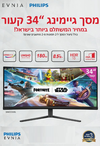 מסך מחשב לגיימרים 34 אינץ' קעור פיליפס Philips 34M2C3500L/00 Evnia 3000 34 Inch Curved 3440x1440 WQHD 180Hz VA 2xHDMI DP Gaming Monitor