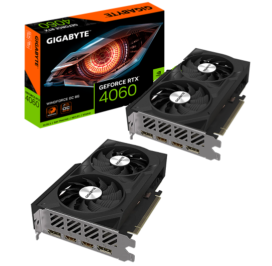 2 כרטיסי מסך לגיימינג ג'יגהבייט Gigabyte RTX 4060 Windforce 2 OC 8GB GV-N4060WF2OC-8GD GDDR6 128Bit 2xDisplay Port 2xHDMI