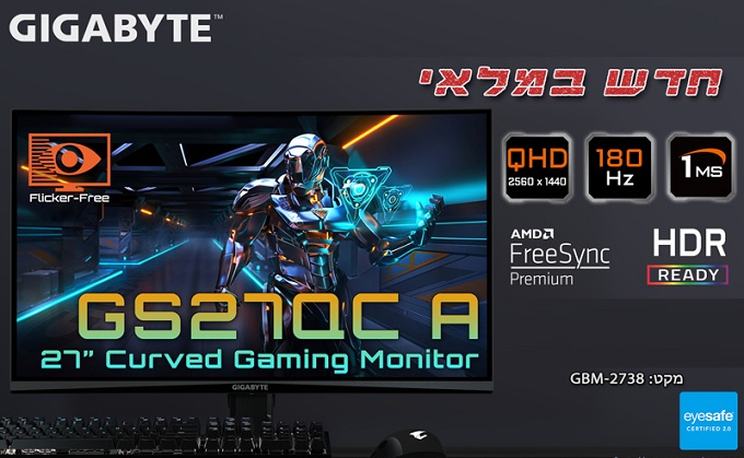 מסך מחשב לגיימרים 27 אינץ' קעור ג'יגהבייט Gigabyte GS27QCA Gaming Monitor 27 Inch Curved 2K 2560x1440 QHD 180Hz VA 1500R 1ms 2xHDMI DP Adaptive Sync