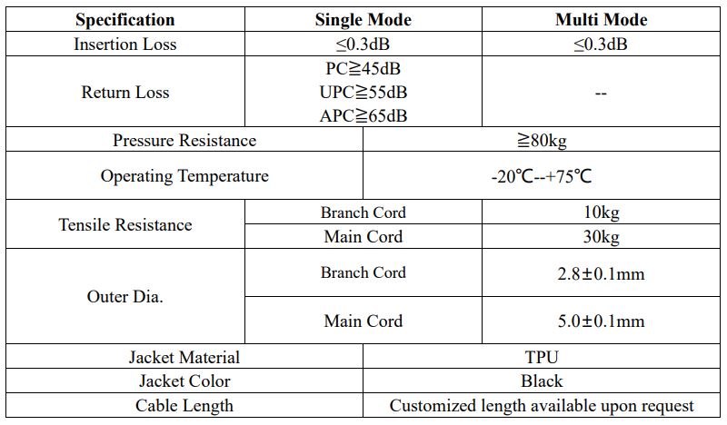 מכיל 4 סיבי סינגל מוד SM G567A1 9/125 עם מחברי LC בקצוות, כולל מכסי הגנה לראשים.