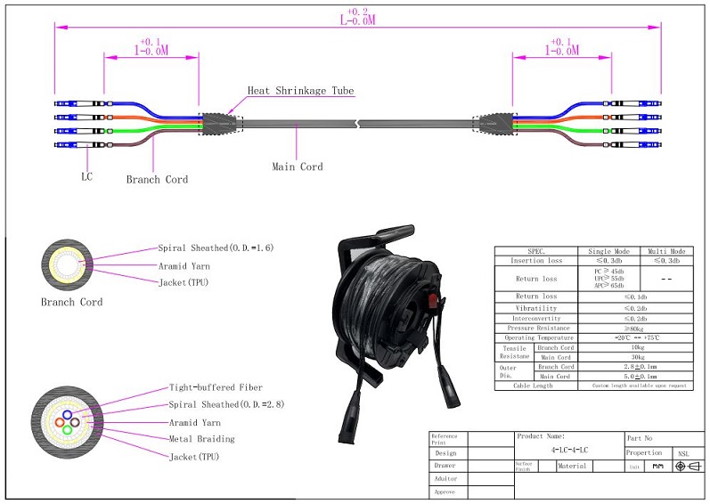 כבל אופטי טקטי (ללא גלגלת) עם 4 סיבים SM מחברי LC באורך 50 מטר TOP-X DRM0304BU-50