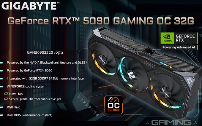 כרטיס מסך לגיימרים כולל תאורה ג'יגהבייט Gigabyte GV-N5090GAMING OC-32GD Nvidia GeForce RTX 5090 Gaming OC 32GB GDDR7 512Bit PCIe 5.0 HDMI 3xDP RGB