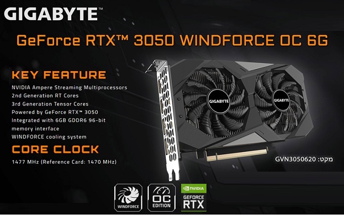כרטיס מסך ג'יגהבייט Gigabyte GV-N3050WF2OCV2-6GD GeForce RTX 3050 Windforce OC V2 6GB GDDR6 PCIE 4.0 x16 96Bit 2xHDMI 2xDP