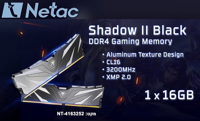 זכרון למחשב נייח נטק Netac Shadow II Black DDR4 16GB 3200Mhz c16 NTSWD4P32SP-16K