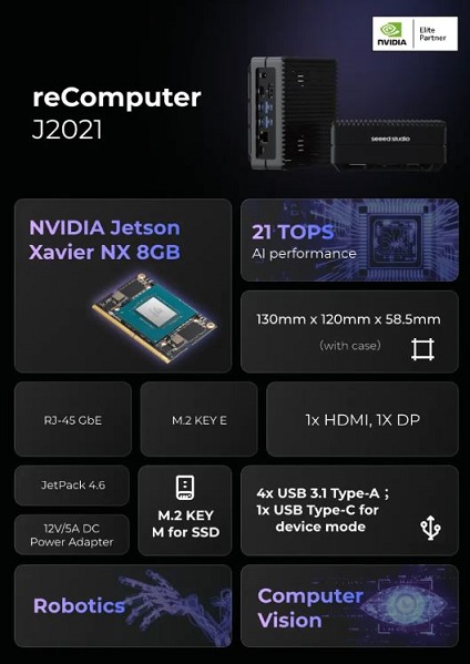 מכשיר חכם חזק וקומפקטי לבינה מלאכותית כולל מודול ג'טסון SEEED Studio reComputer J2021-Edge AI Device with Jetson Xavier NX 8GB Module
