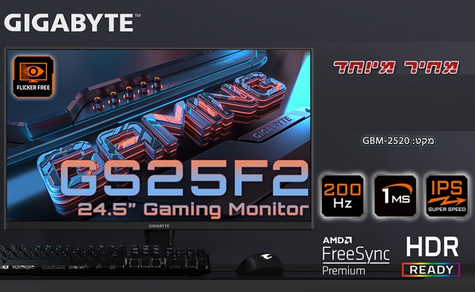 מסך מחשב לגיימרים 24.5 אינץ' ג'יגהבייט Gigabyte GS25F2 Curved Gaming Monitor 24.5 Inch FHD 1920x1080 SS IPS 200Hz 1ms 2xHDMI DP Speaker Earphone Jack AMD FreeSync Premium