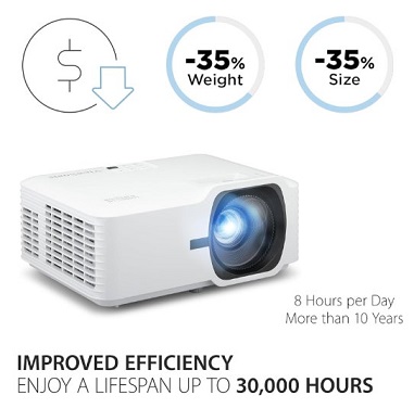 העיצוב ללא מנורה מציע פתרון ידידותי לסביבה וחסכוני, בעוד שמשקלו הקל והעיצוב הקומפקטי של המקרן מפחיתים