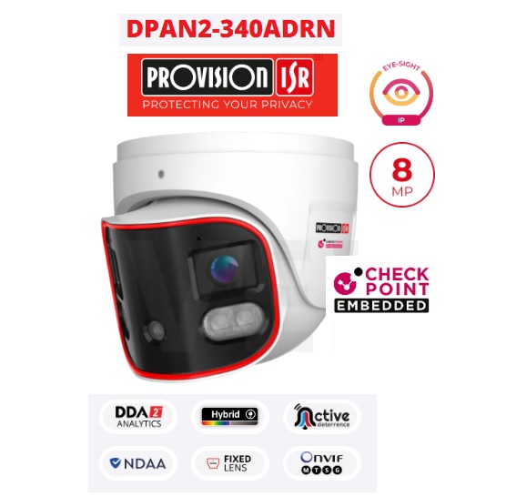 מצלמת כיפה פנורמית עדשה קבועה x2 צבע יום ולילה אינפרא IP רשת כולל אודיו פרוויז'ן Provision Eye-Sight DPAN2-340ADRN 8MegaPixel 2.8mm 180° x2 Dome Camera with Hybrid LED and DDA2 Analytics 30M PoE Real Time True IP Camera