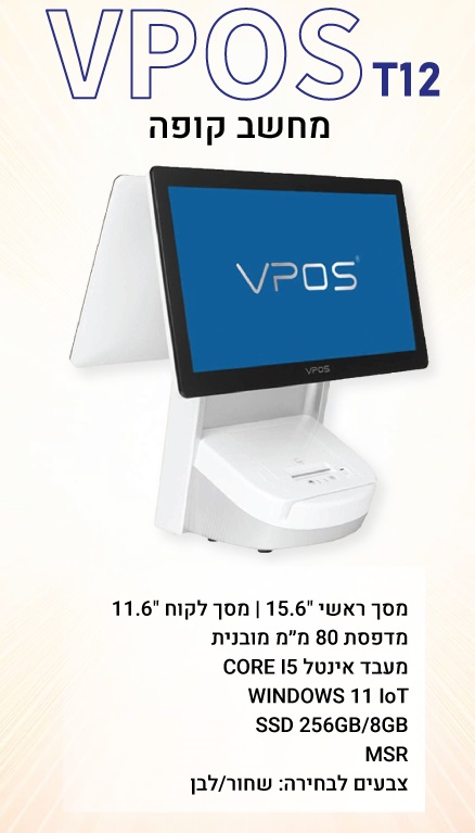מחשב קופה רושמת עם שני מסכים 15.6 אינץ' ראשי 11.6 אינץ' לקוח כולל מדפסת 80 מילימטר מובנית VPOS T12 POS Computer with Two Screens 15.6 inch Main 11.6 Inch Customer Includes a Built-in 80mm Printer Intel Core i5 8GB RAM 256GB SSD MSR Windows 10/11 IoT