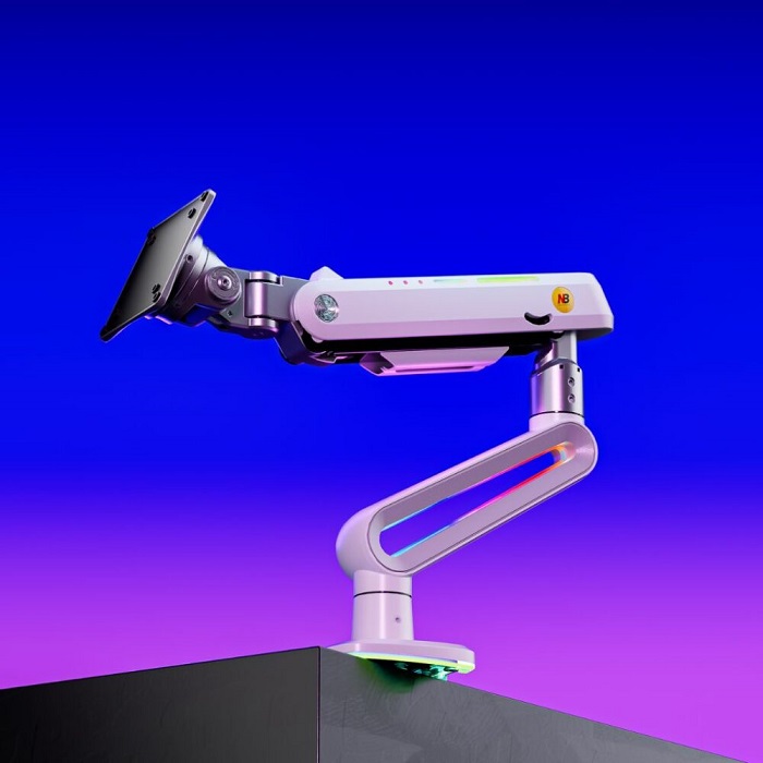 זרוע שולחנית דו מפרקית הידראולית למסכי גיימינג כולל תאורה ומסכים כבדים 32 עד 60 אינץ' משקל עד 20 קילו אורך מירבי 62 ס''מ גובה מירבי 49 ס''מ צבע לבן North Bayou NB E6 RGB Gaming Monitor Arm Hydraulic Double-Jointed Desktop Arm 32 Inches to 60 Inches Heavy Duty Weight up to 20kg White