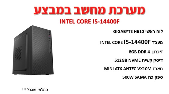מחשב נייח לבית למשרד לאופיס ואינטרנט דור 14 אינטל יש להוסיף כרטיס מסך Gigabyte GA-H610M H Antec VX10M Mini Tower Case Intel 10Cores I5-14400F 4.7GHz SSD 500GB M.2 NVMe 8GB DDR4 HDMI Free Dos