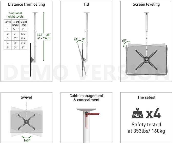 זרועה לתקרה יוקרתית עם מנגנון פטנט מיוחד מתאים למסך שטוח\קעור עד 40 קילו.