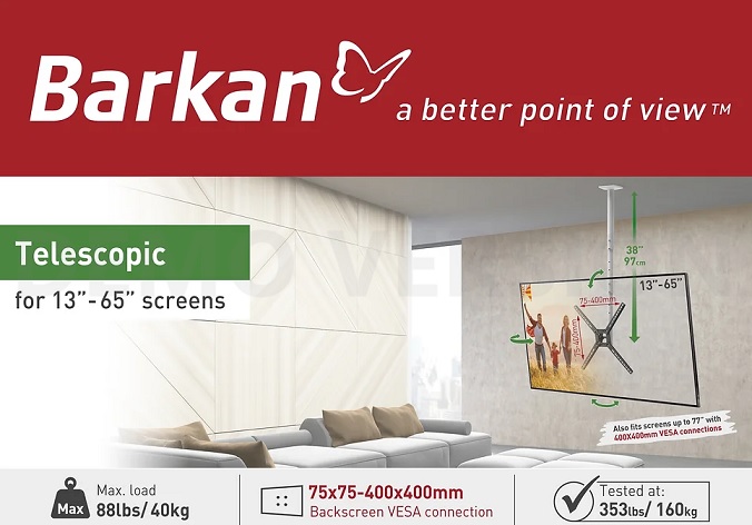 זרוע טלסקופית לתקרה לבנה לטלוויזיה כולל סיבוב,הטייה עד 45 ק''ג 2 צירי סיבוב 160° והטייה בעזרת רפידות חיכוך מ 0° עד 25° 65'' barkan BI35 38cm-96.5cm