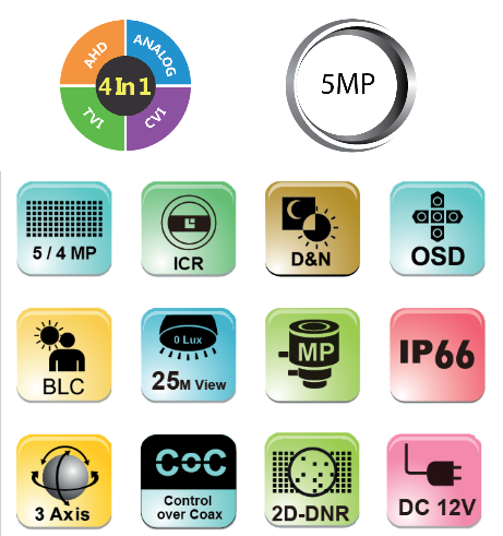 5MP AHD/TVI; 4MP AHD/TVI/CVI;CVBS Camera• Sensor: 1/2.7”
