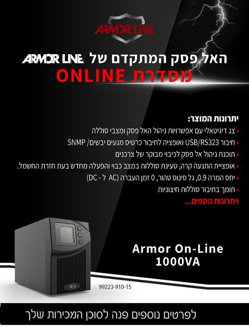 אל פסק ומייצב מתח און ליין Armor Line UDC9101S 1kVA-HF online tower +2batteries 9Ah 1000VA/900W On Line