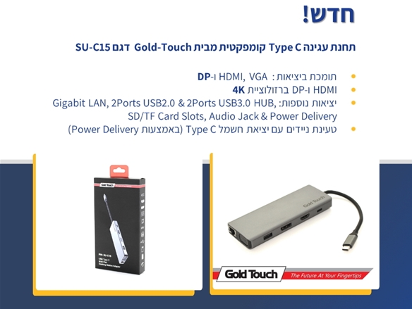 תחנת עגינה מולטיפורט מיני דוקינג למחשב נייד כולל שקע טעינה Gold Touch SU-C15 USB3.1 Type-C To Multi Port Docking Station w/i DisplayPort